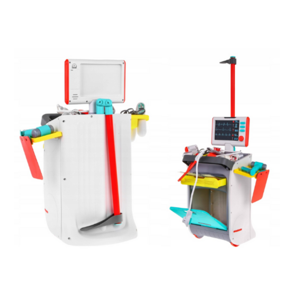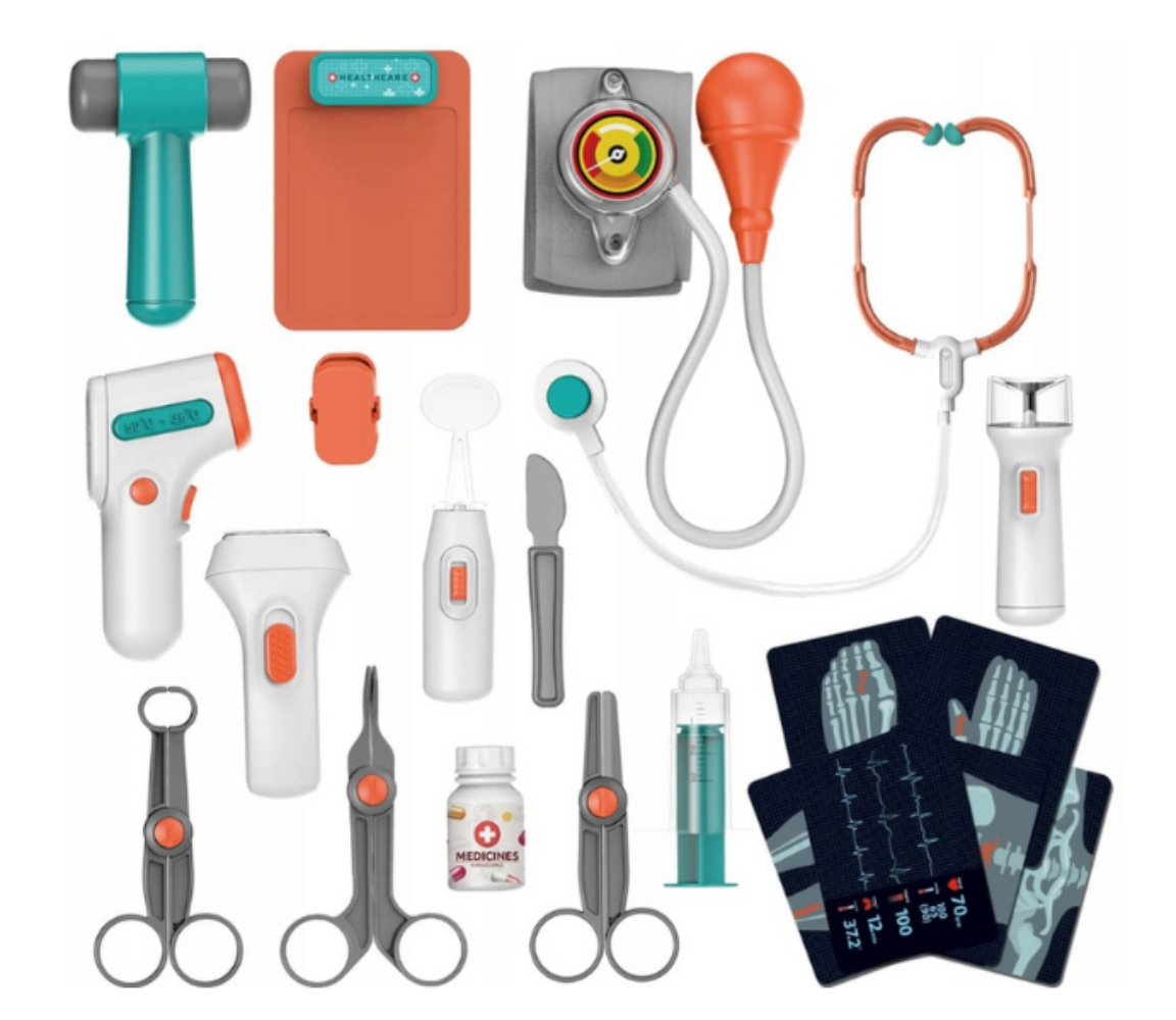 Sub forma unei stații medicale complete, setul include un cărucior dotat cu aparate, panou de control și peste 15 accesorii realiste, care redau sunete și lumini specifice unui cabinet adevărat. Copiii pot asculta bătăile inimii cu stetoscopul funcțional, pot verifica temperatura cu termometrul luminos, pot examina pacienții cu lanterna și oglinda dentară sau pot realiza „ecografii” cu sonda USG interactivă.